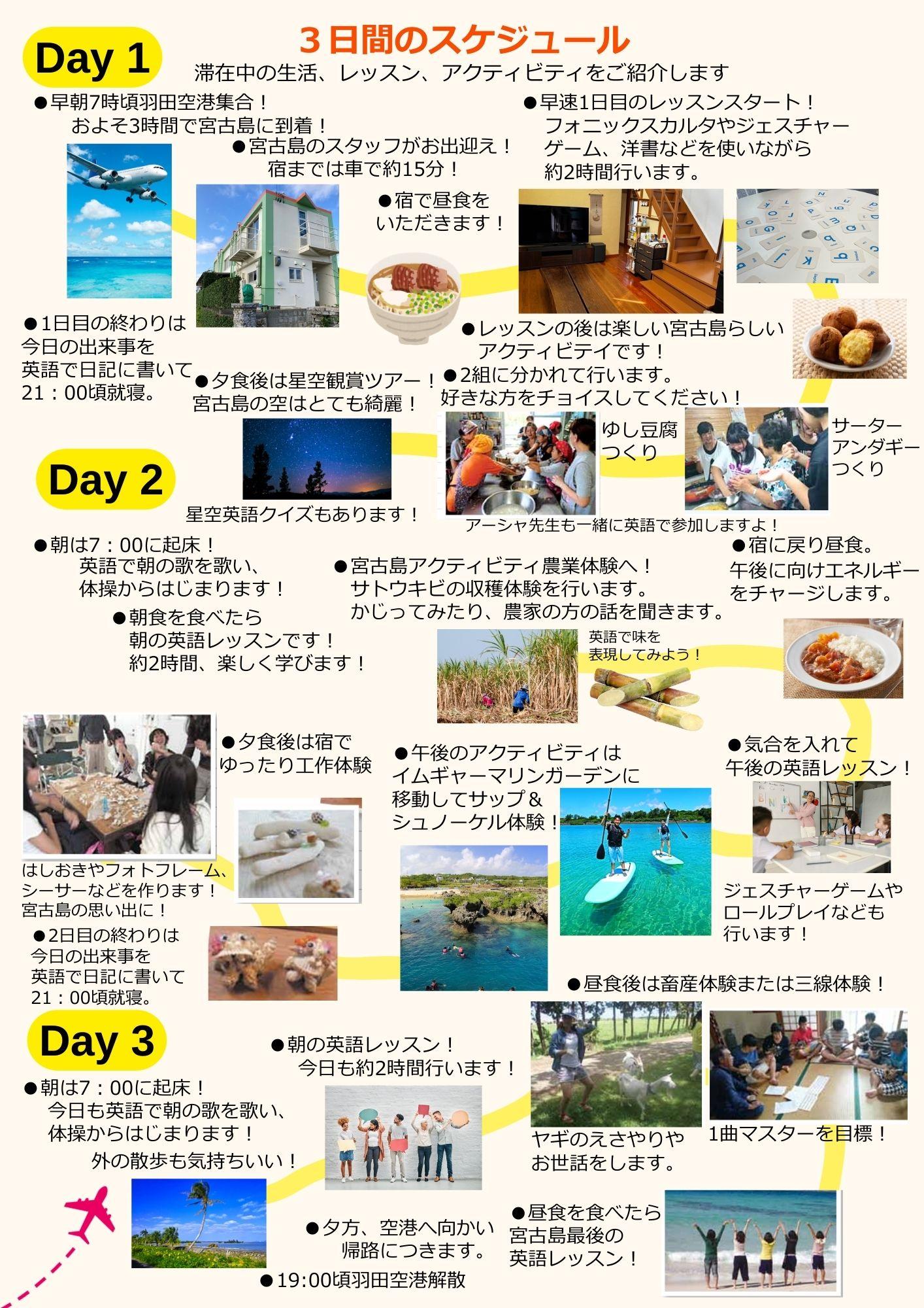・往復飛行機代 ・宿泊費・食費 (2泊7食(1日目昼食・夕食/2日目朝食・昼食・夕食/3日目朝食・昼食)) ・アクティビティ費用 ・空港からの移動費用 ※各自必要な費用:お土産購入などのおこずかい程度の費用 |